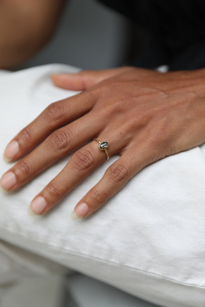 This salt and pepper diamond ring is full of mystery and light. The diamond facets sparkle beautifully, while still looking stormy and intriguing. This unique diamond is wrapped in a 22k gold bezel and set in a slightly textured 18k yellow gold band. In stock in size 6; please allow 4-6 weeks for all other sizes.