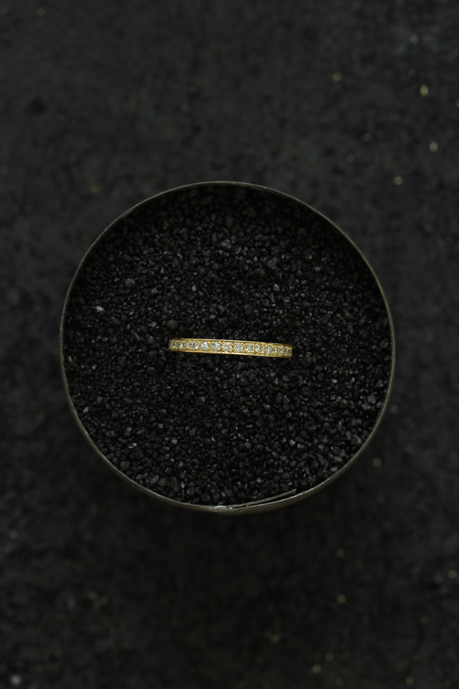 18k gold ring with approximately thirty two .01ct white brilliant cut diamonds set continuously in a 2.5mm band.