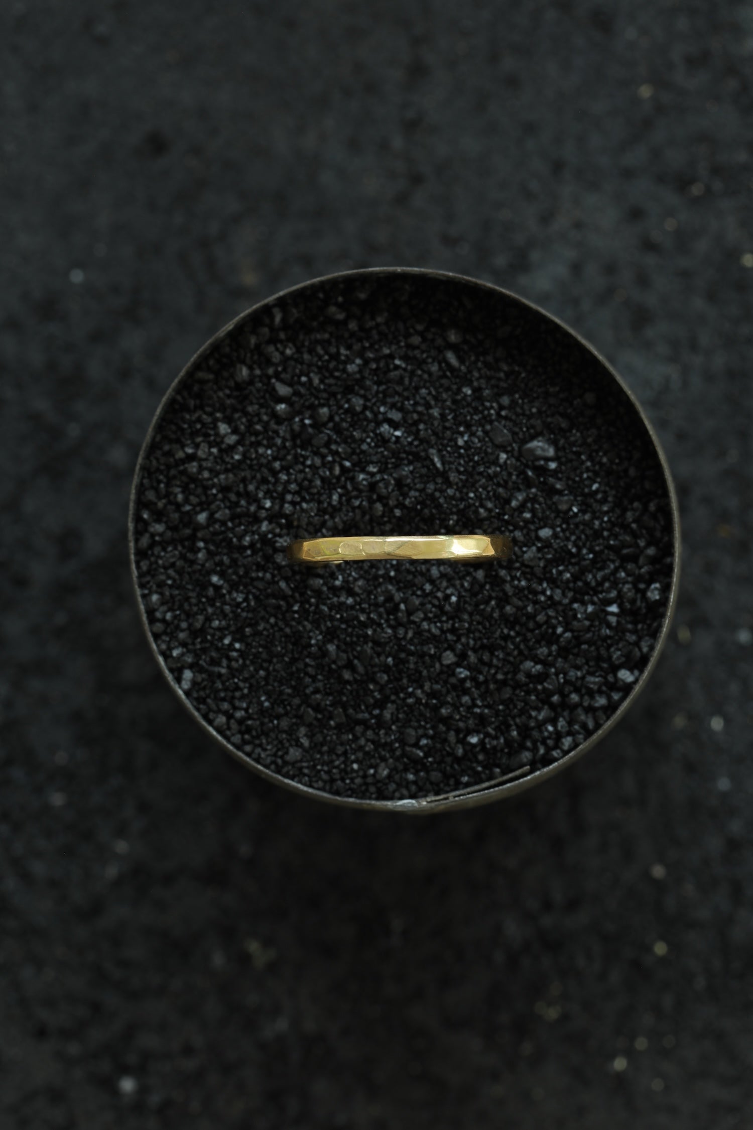 This is a very satisfying hearty hand hammered band that reflects light off its facets beautifully. Great for stacking, stand alone, or would make a lovely wedding band.