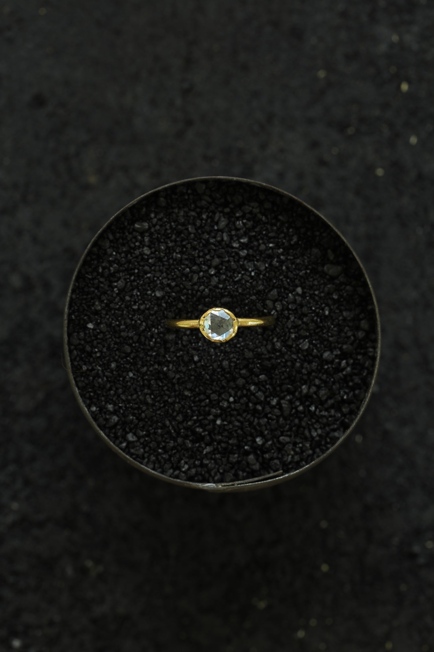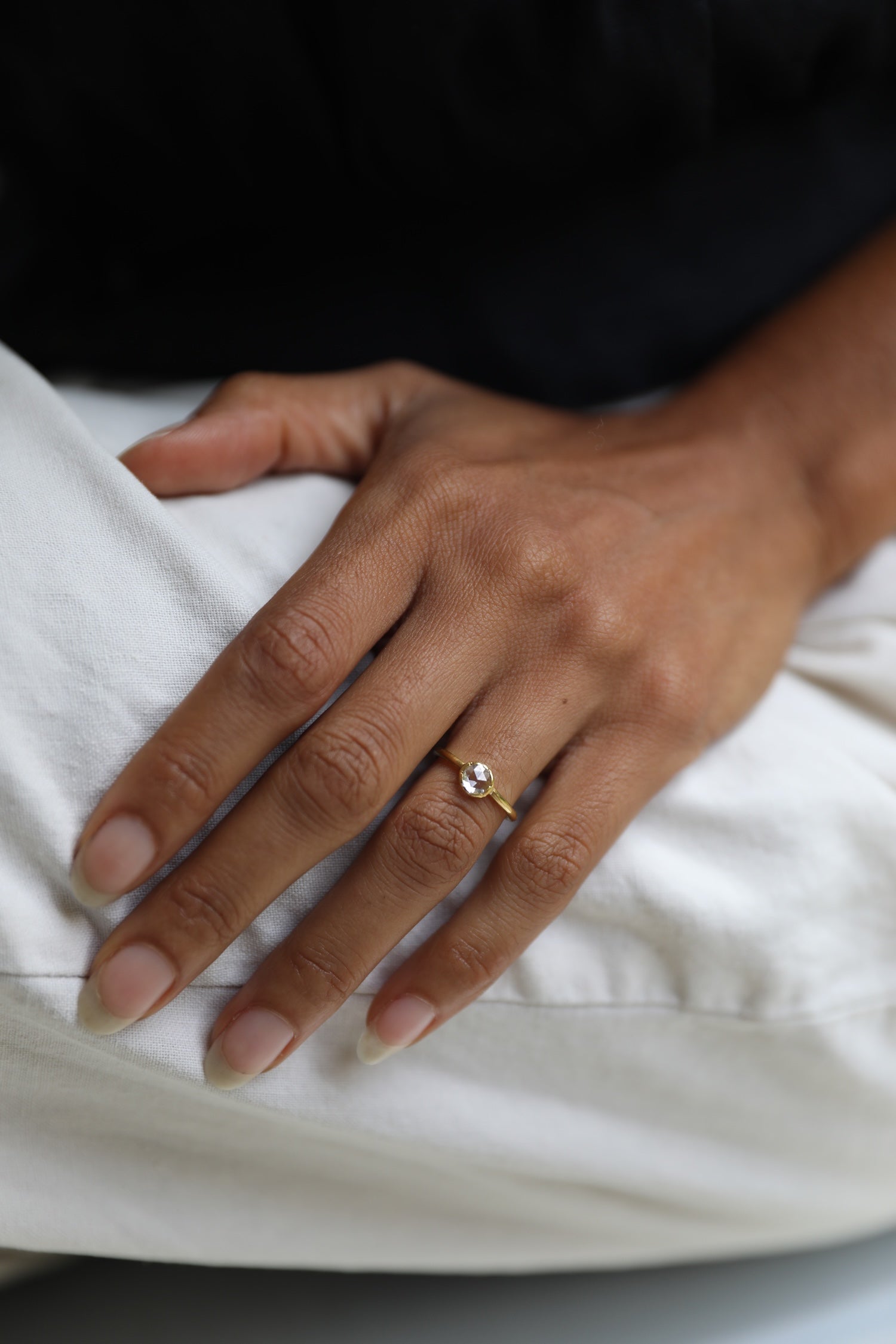 Round .47 carat round rose cut diamond set in a 22k yellow petal bezel. The bezel has an open back and is set on the band. I love to think of this as a simple precious engagement ring or every day ring to add some sweet sparkle.