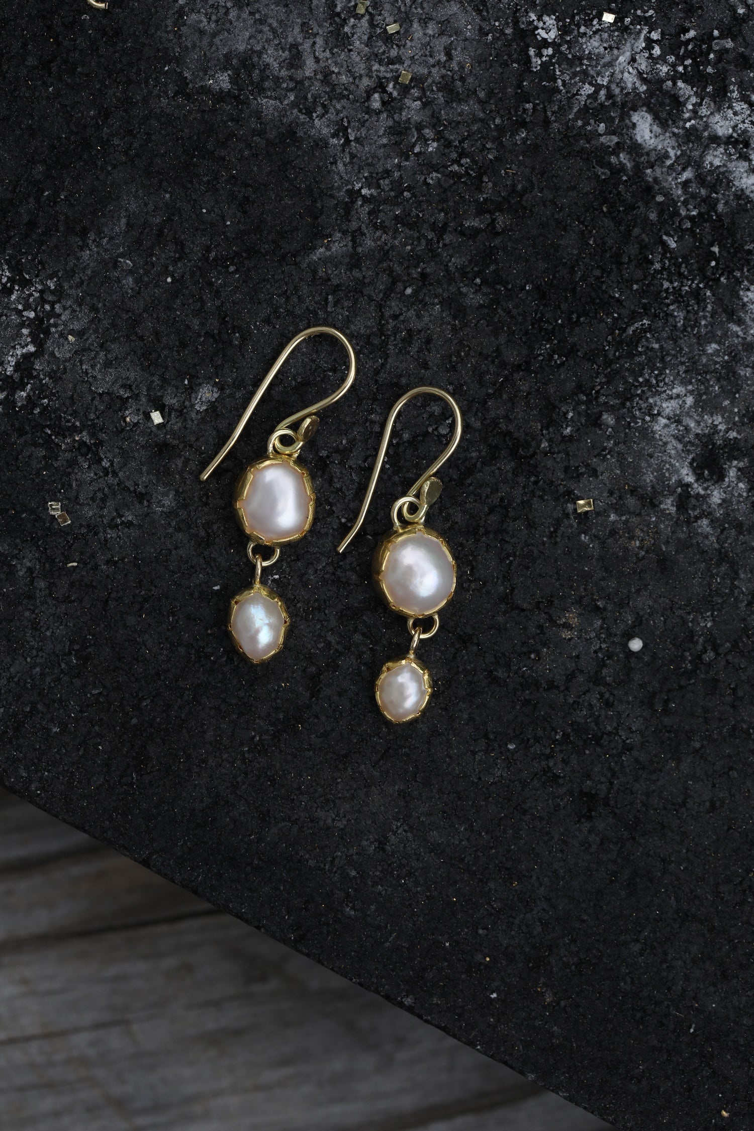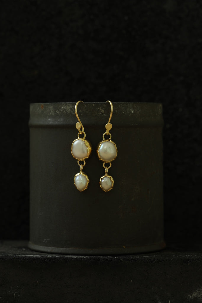 I have been falling more and more in love with pearls with each piece I make! These pearls are set in 22k hand filled petal bezels, hanging off a handmade 18k ear wire. Pearls are associated with the moon, and bring a calming and cooling energy to one's mind and soul, bringing peace and balance.