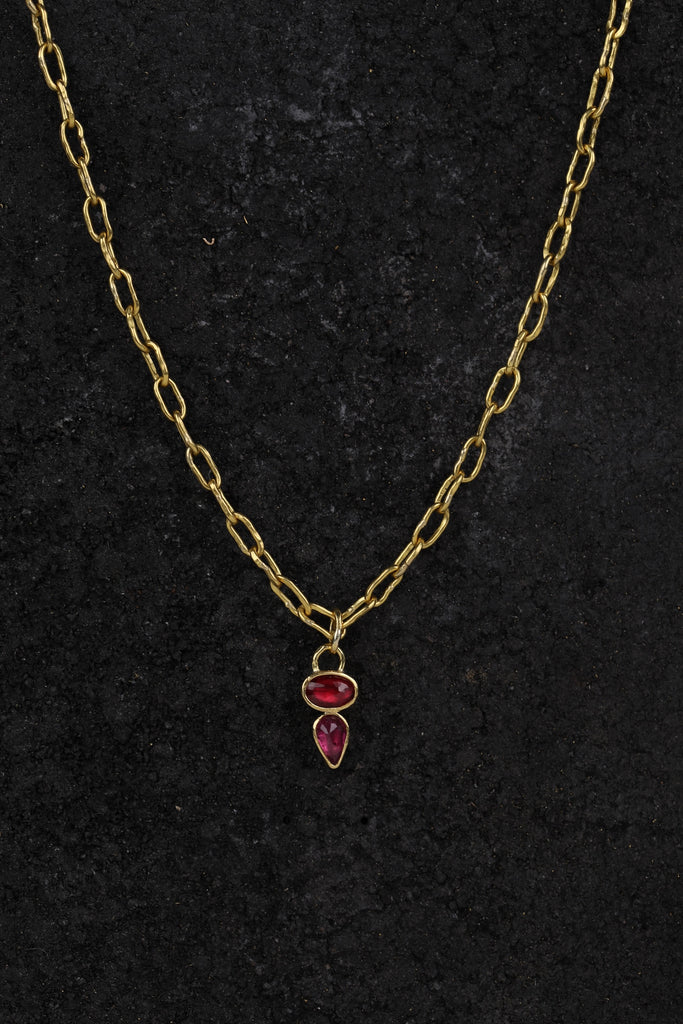 I love the rich color of these rubies! The rubies are a combined weight of one carat and are set 22k yellow with an extra large 18k jump ring that is made to fit over your own chain or can be purchased with one of the chain options below.