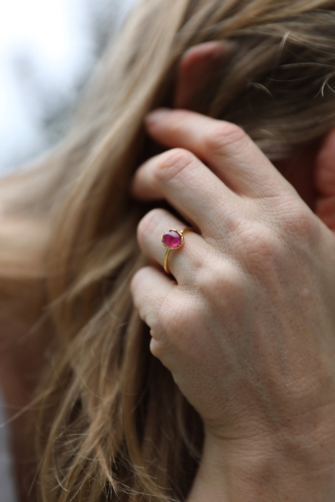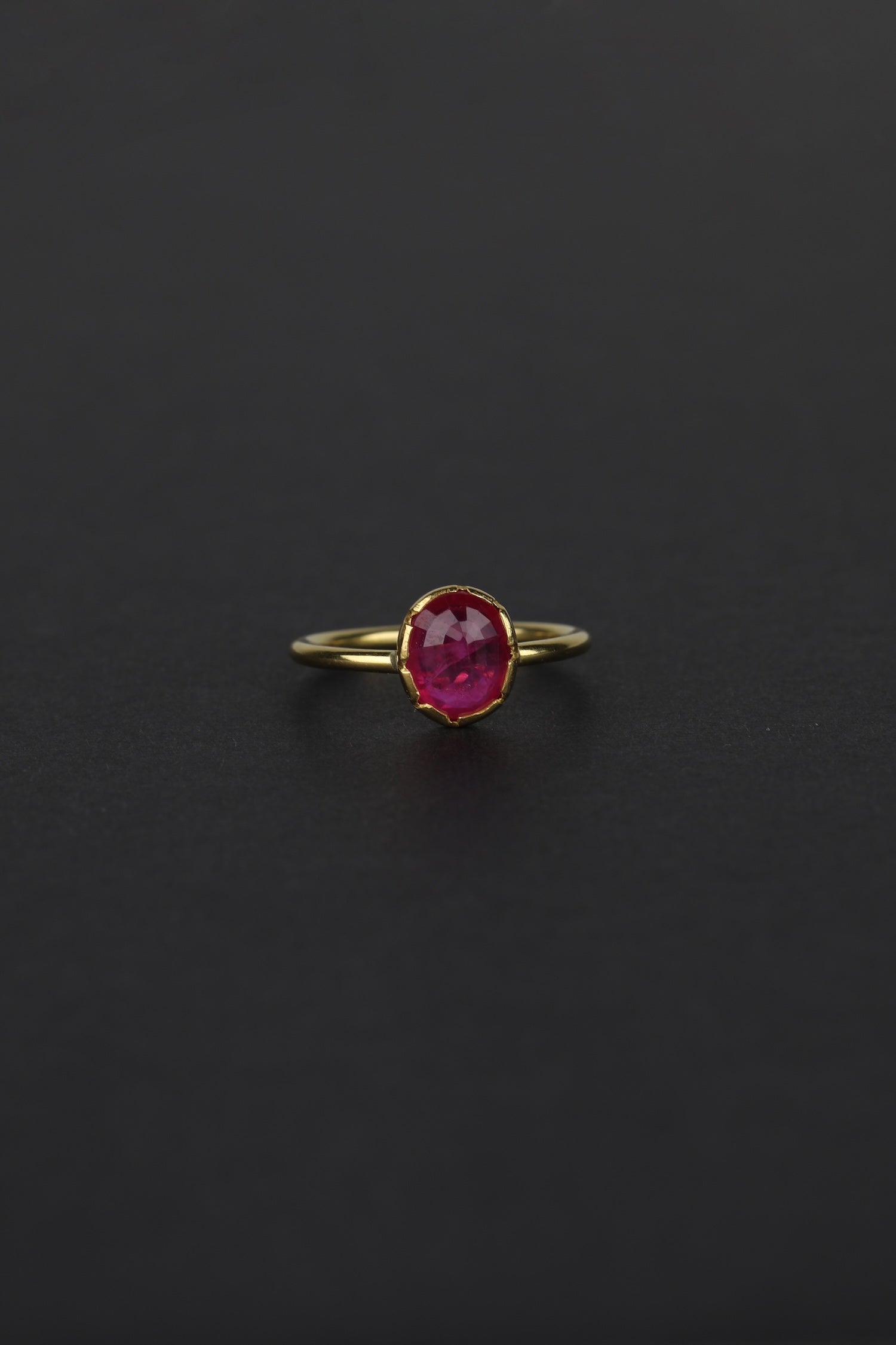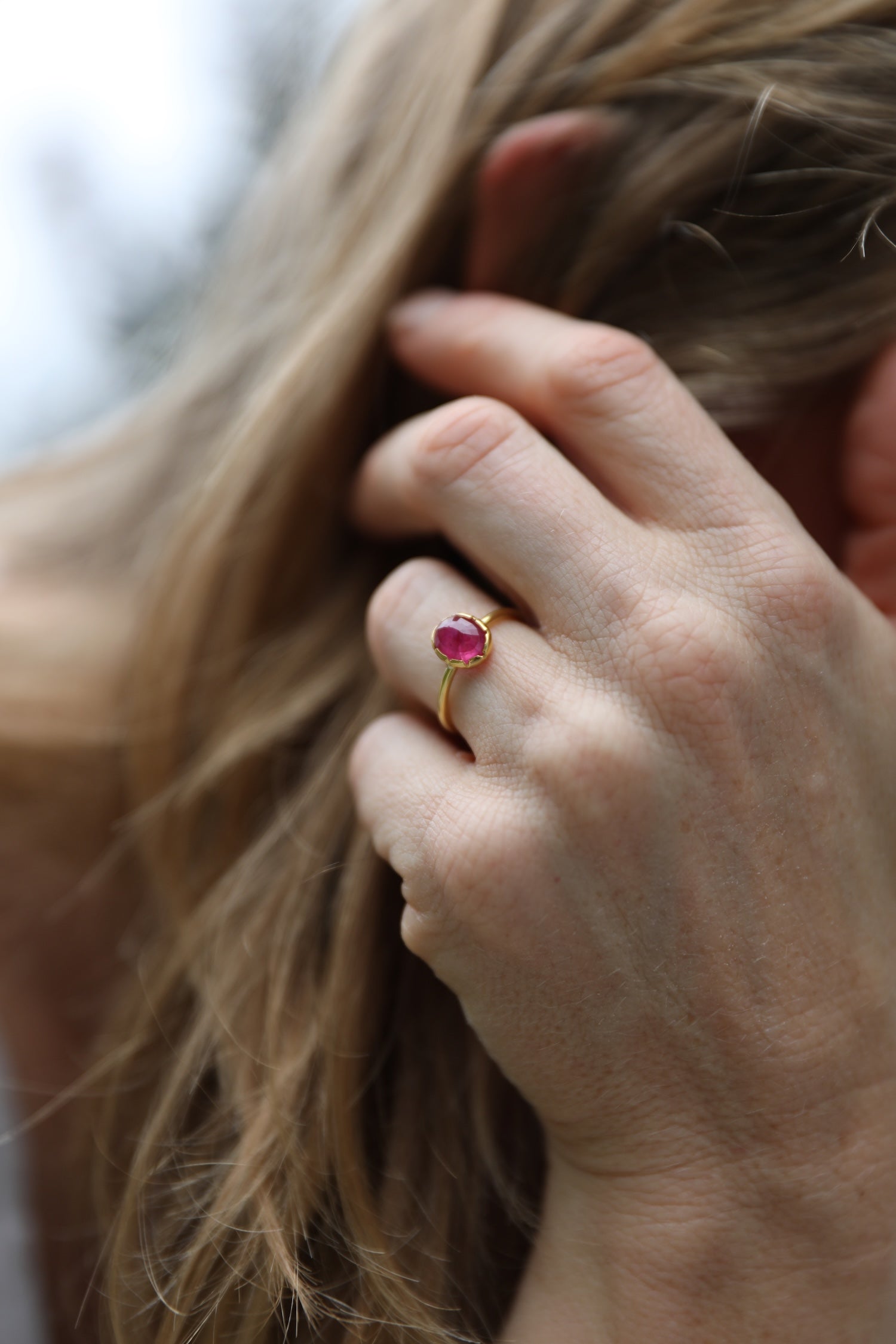 This is such a juicy ruby; like a ripe cherry or raspberry. The ruby is 1.96 carats, set in a 22k gold hand-filled petal bezel with a thick rounded 20k band. The bezel has an open back so the ruby touches the skin, connecting the wearer to the beautiful energy rubies share.