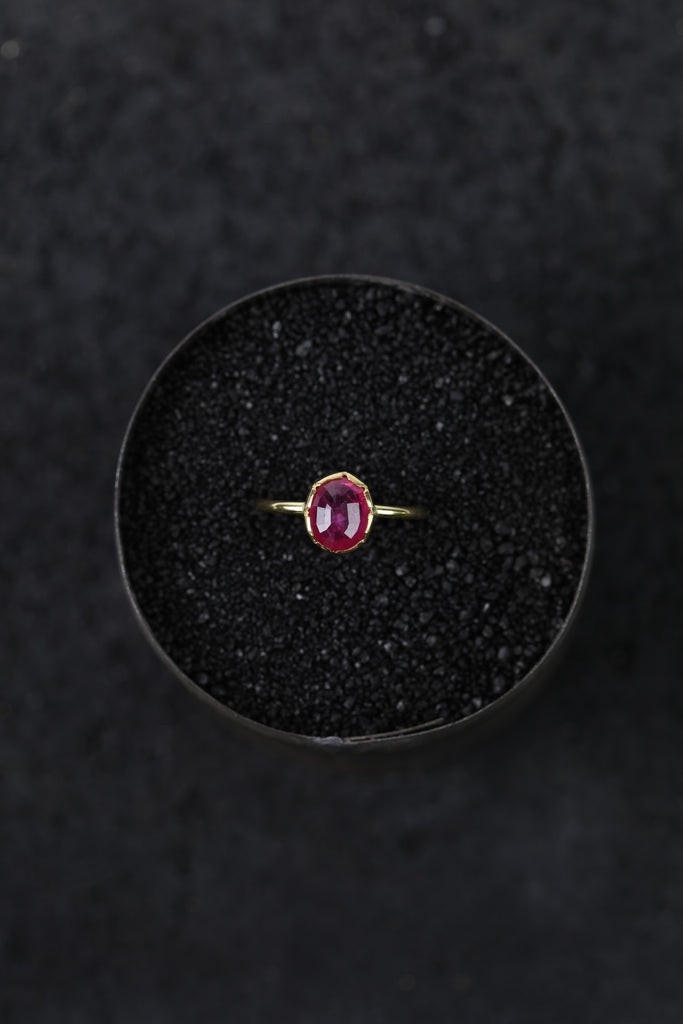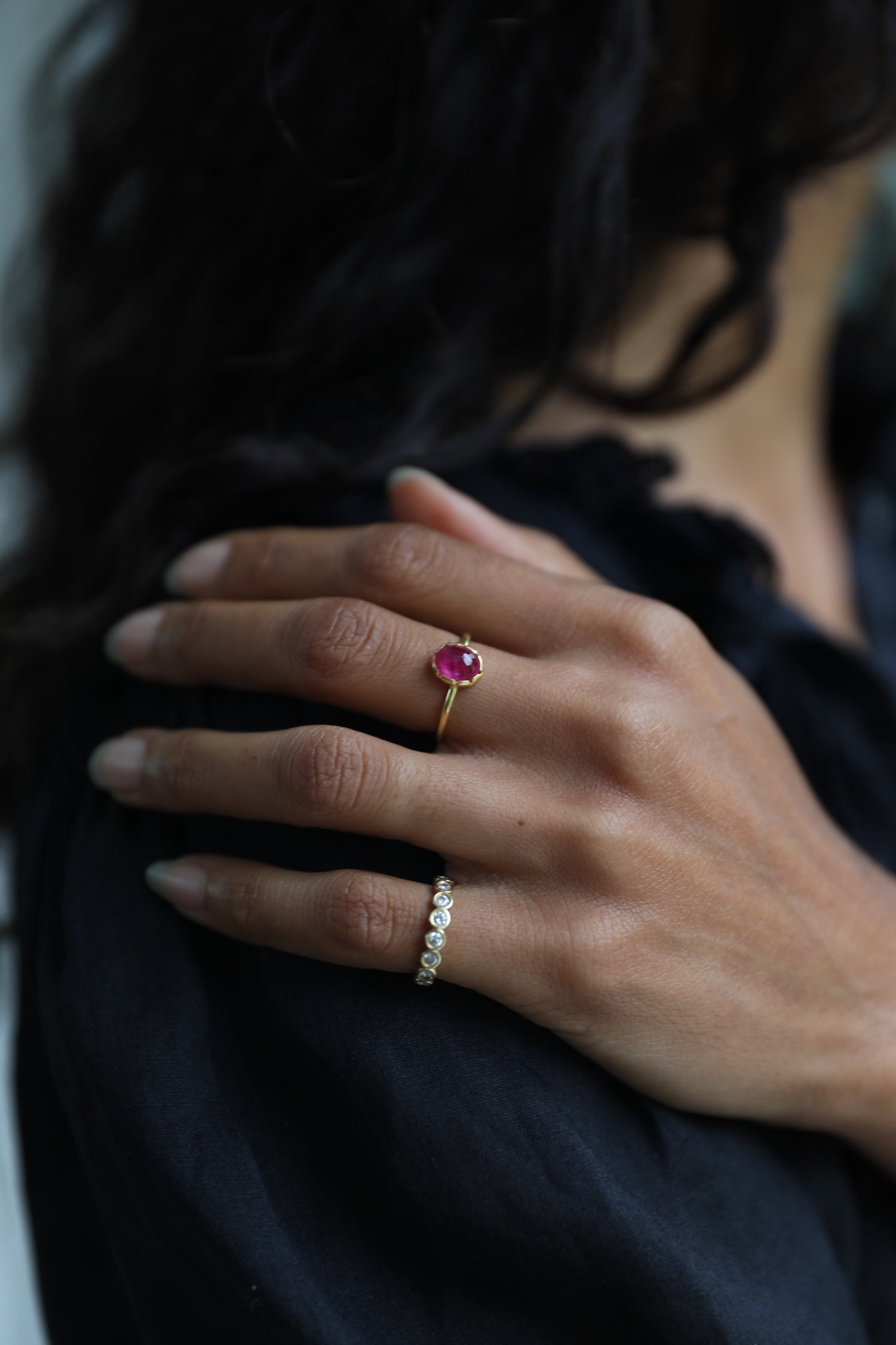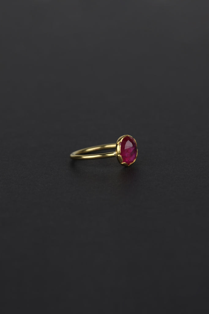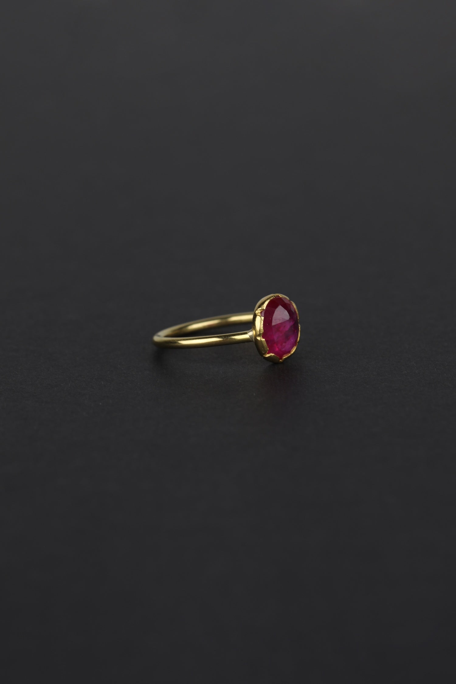 This is such a juicy ruby; like a ripe cherry or raspberry. The ruby is 1.96 carats, set in a 22k gold hand-filled petal bezel with a thick rounded 20k band. The bezel has an open back so the ruby touches the skin, connecting the wearer to the beautiful energy rubies share.