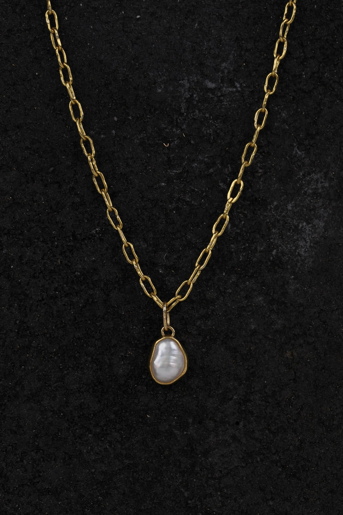 I am enchanted by pearls! Each one of these pearls is totally one of a kind and unique. Set in a 22k gold bezel with an extra large 18k gold jump ring that is made to fit over your own chain or pick from one of our chains.