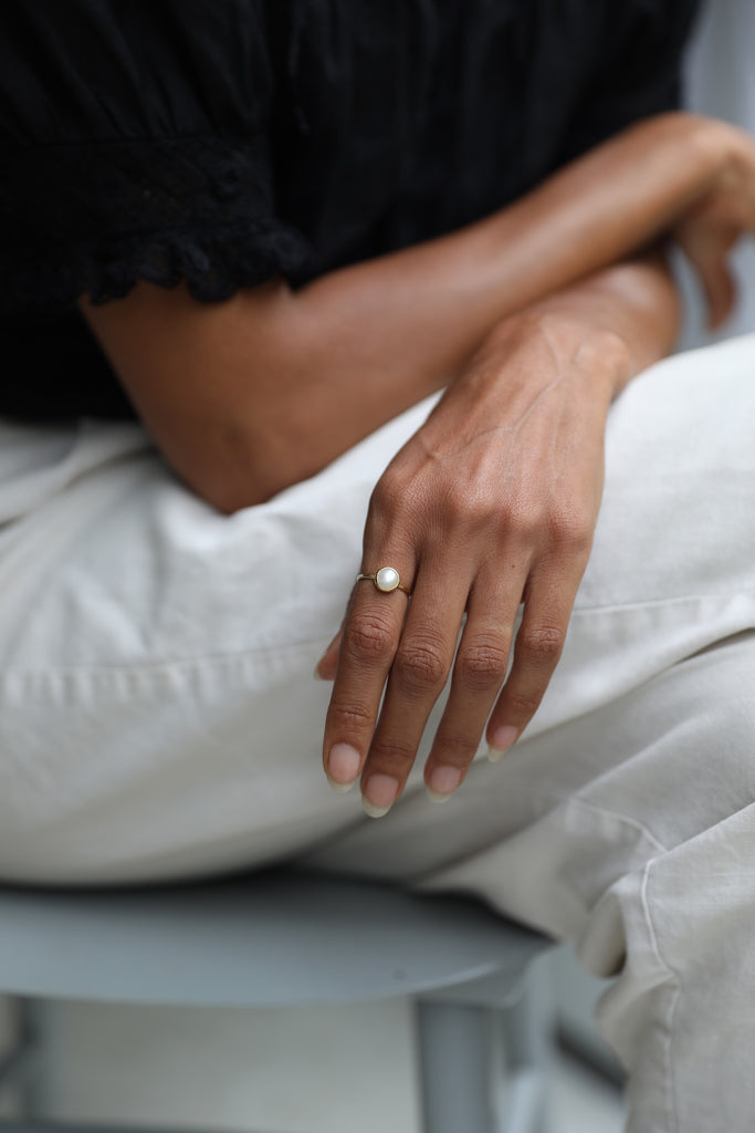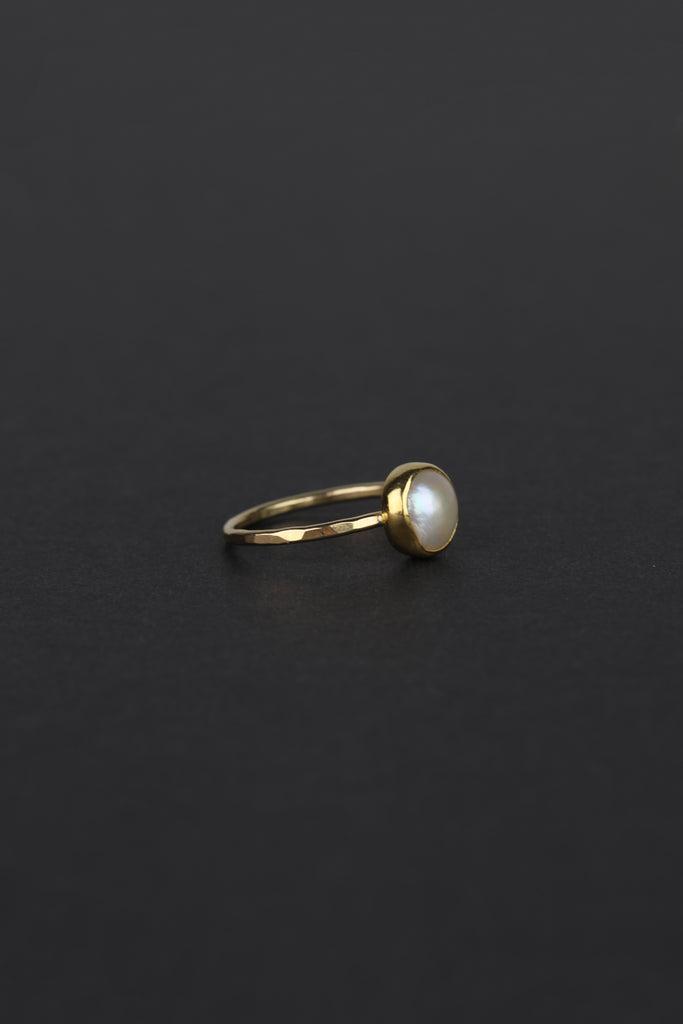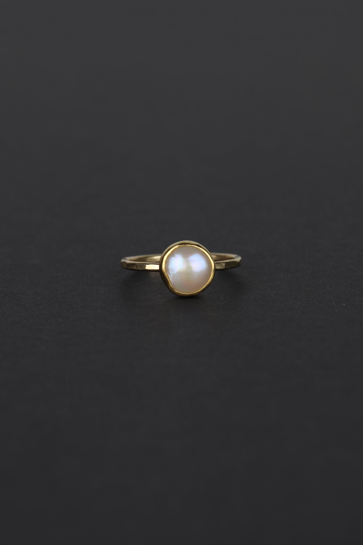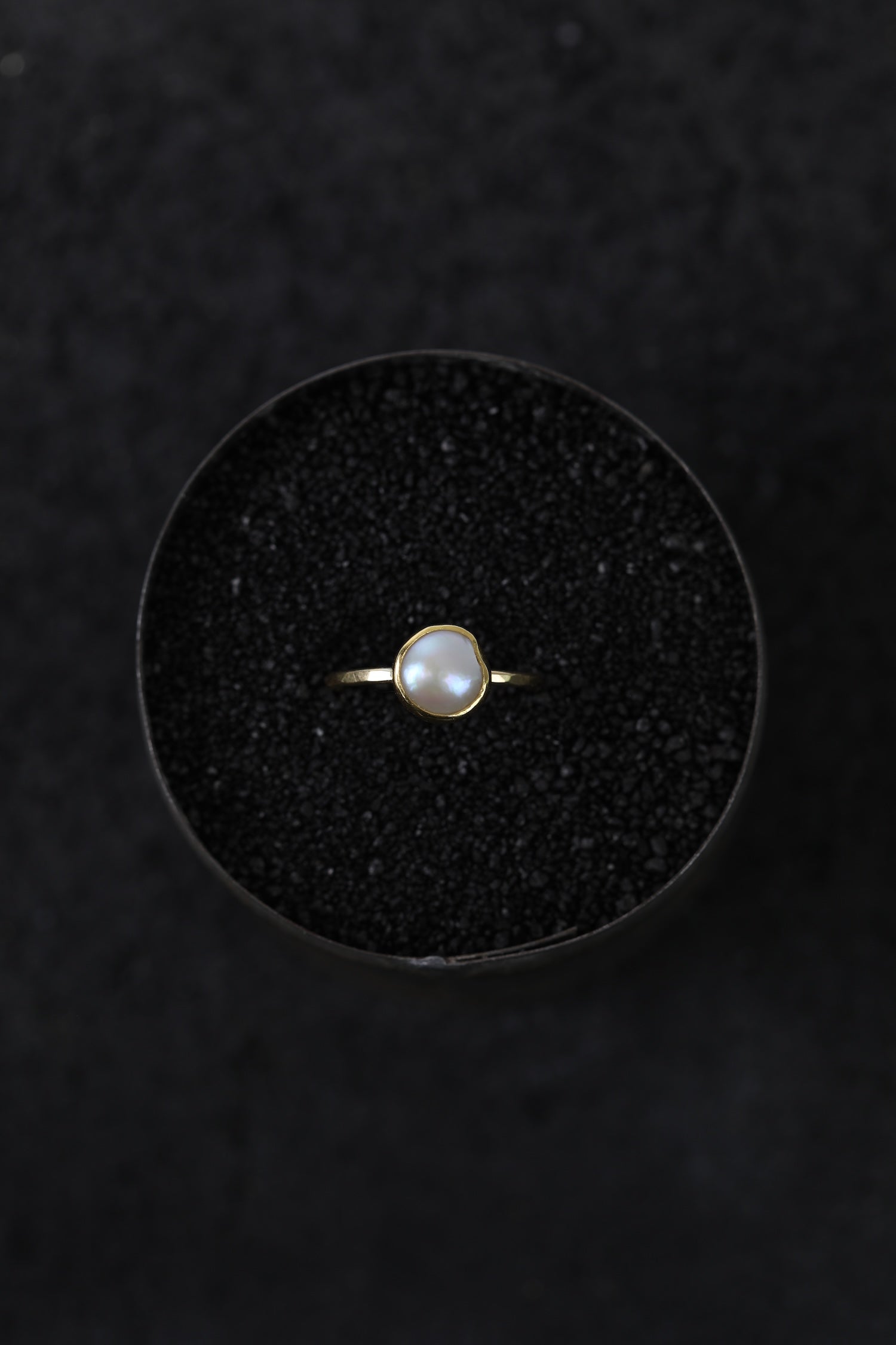 This pearl reminds me of the glow of a full moon! Set in 22k gold with an open back so the pearl can work its magic by touching the skin. Set on an 18k gold band.