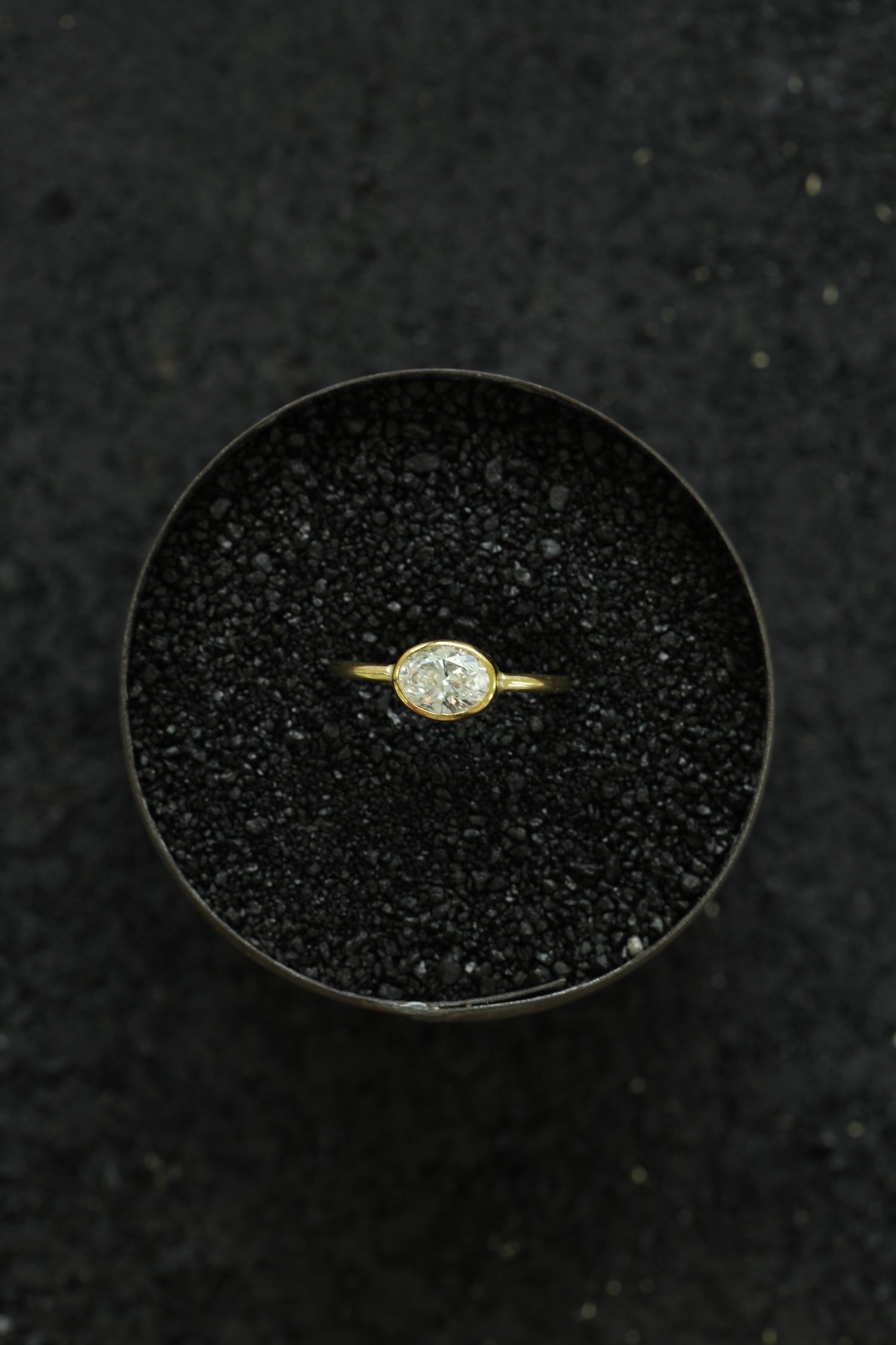 This is a stunning one carat G color SI1 oval diamond set into a 22k yellow gold bezel with an open back. The bezel is set into a thick rounded band. This ring is a little bit of celestial magic. A perfect engagement ring or epic ring to add to your stack.