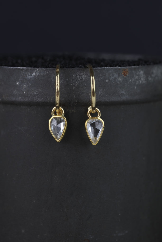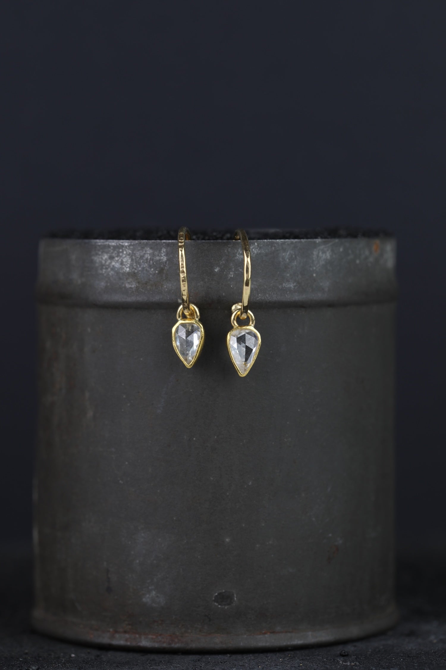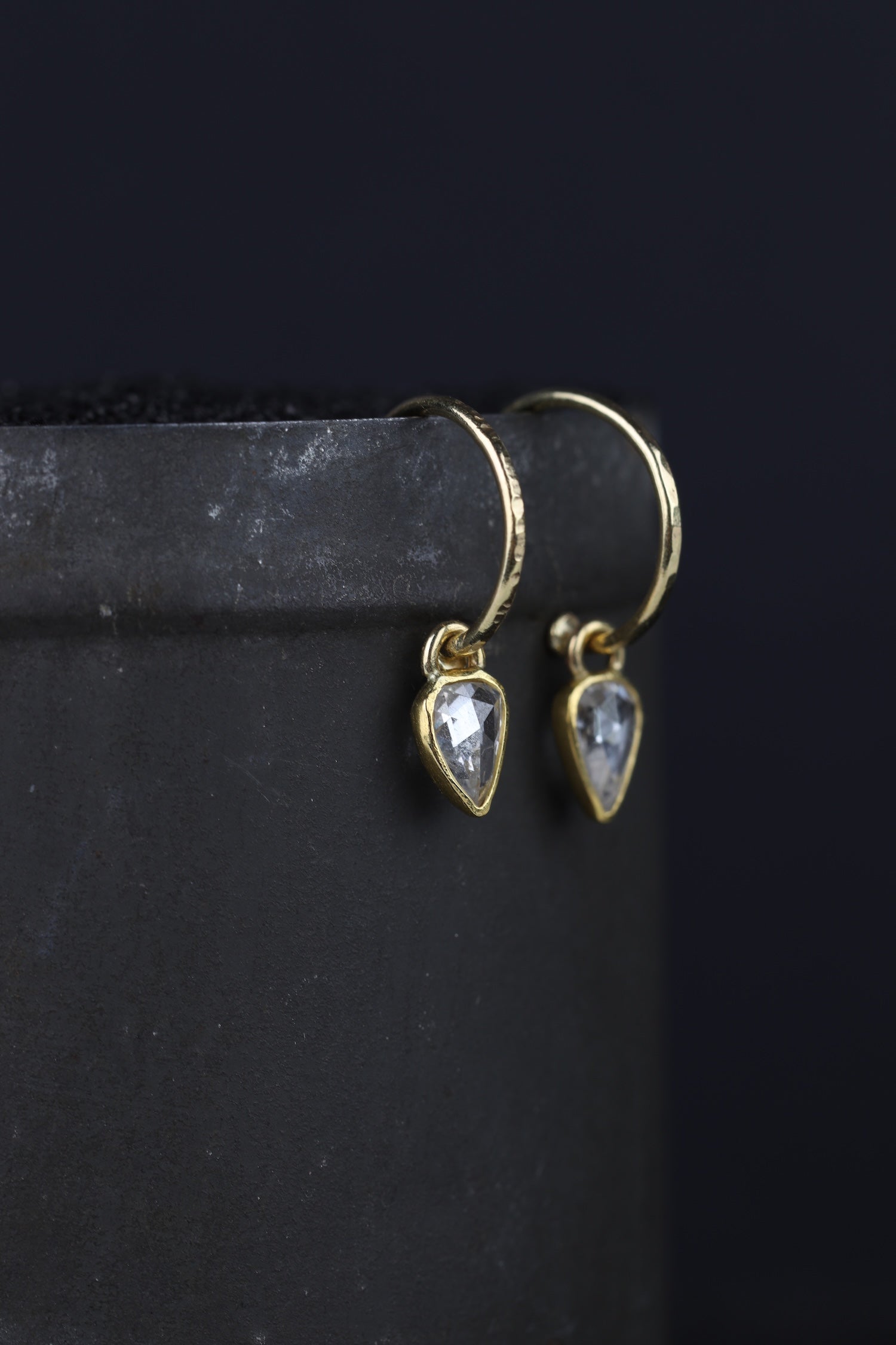 These are beautiful pear-shaped rose cut diamonds are set in 22k gold bezels. They hang from textured 18k yellow gold hand-hammered hoops. This pair of rose cut diamonds are a combined weight of .75 carats and are perfectly clear. The diamonds can be removed from the hoops and the hoops can be worn on their own, making these two earrings in one.