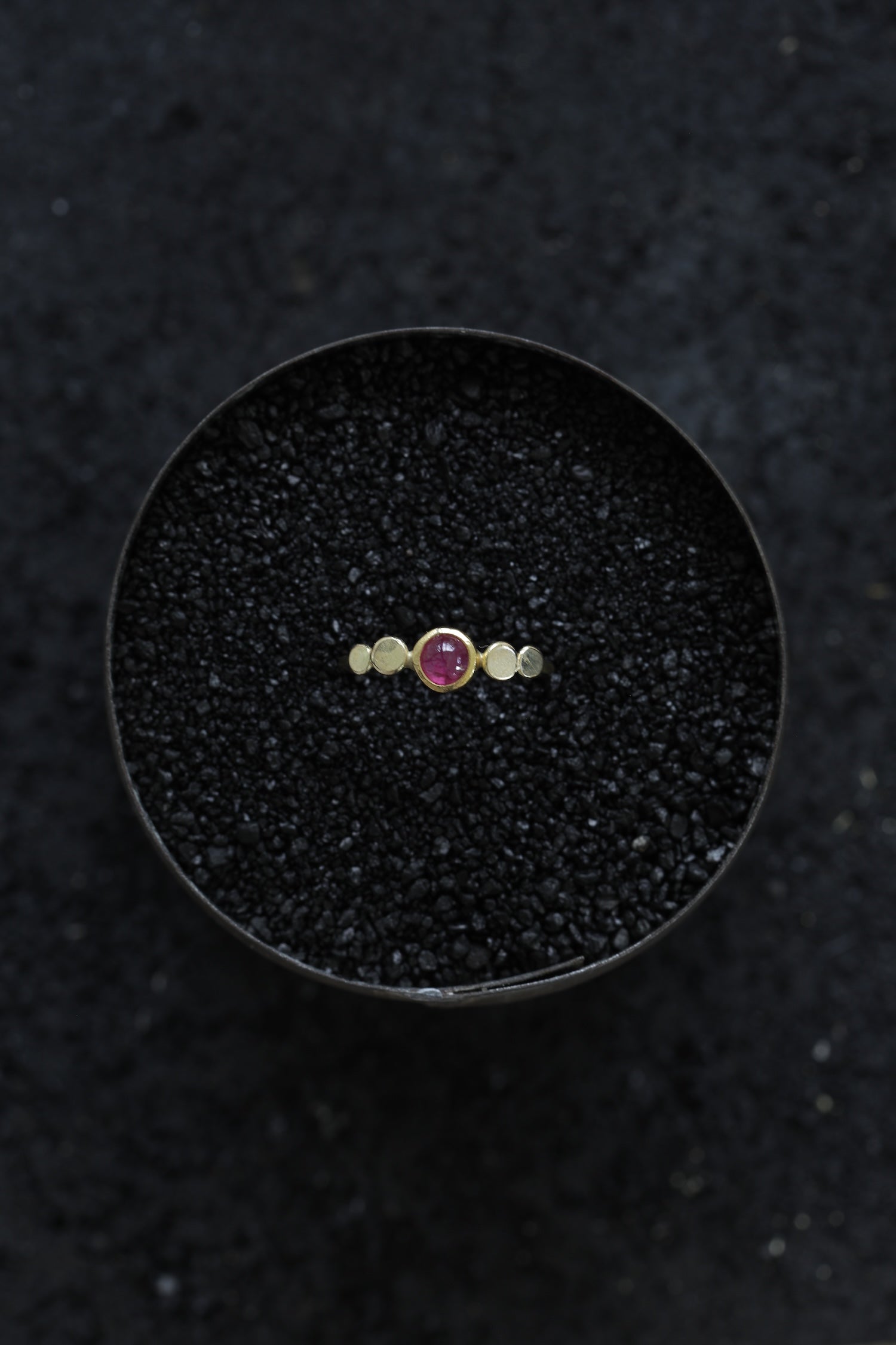 This is a small cabochon ruby with tapered side hand hammered coins. This ring is a mixture of 22k and 18k yellow gold.
