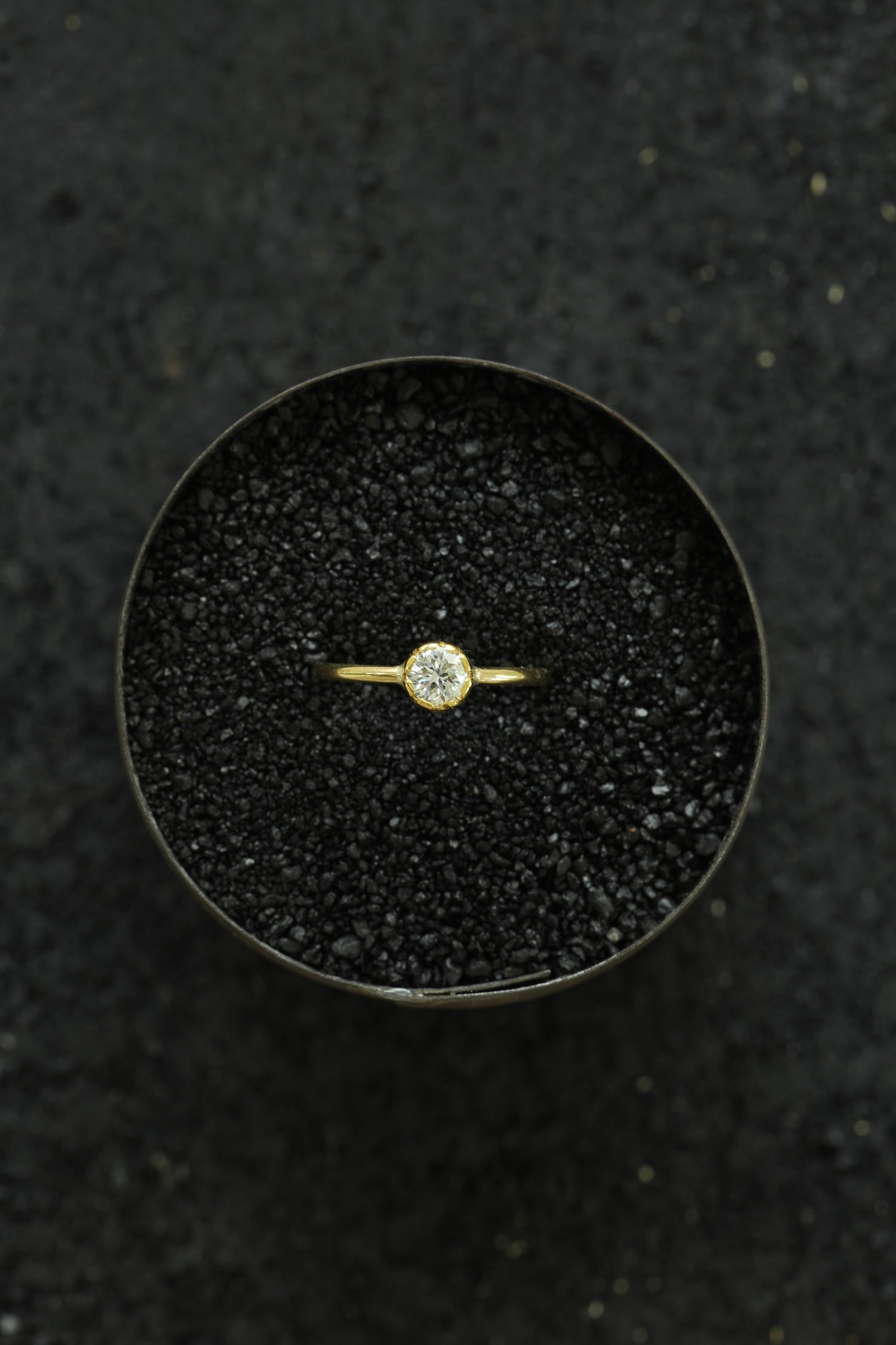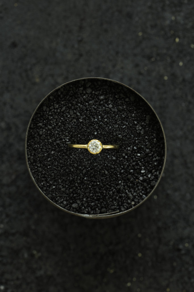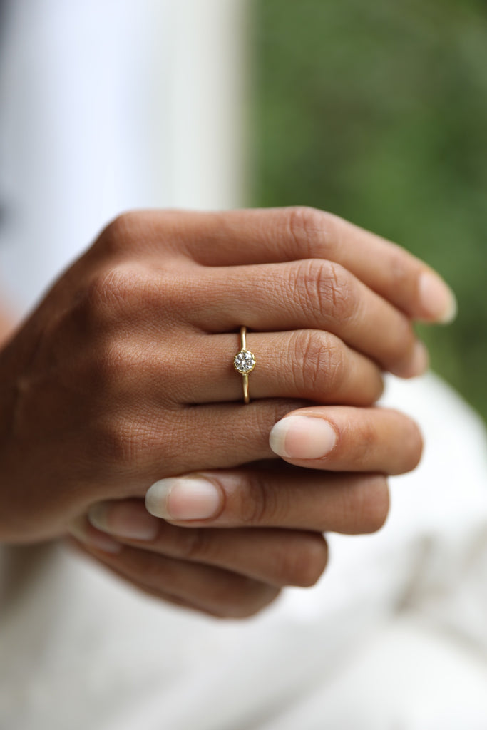 .40 carat round diamond set in a 22k gold petal bezel, with an 18k thick rounded band. This is such a sweet and sparkly engagement ring, or every day ring.