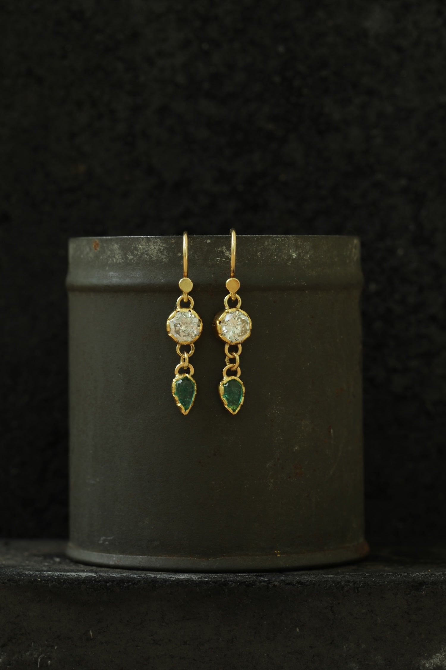 These beautiful, sparkly round brilliant cut diamonds (.64 carats each) give some major bling to these ancient feeling earrings. Paired with ocean green rose cut pear shaped emeralds (.30 carats each). The stones are all set in 22k yellow gold petal bezels, and topped with handmade 18k gold ear wire with a hand hammered coin at the top.