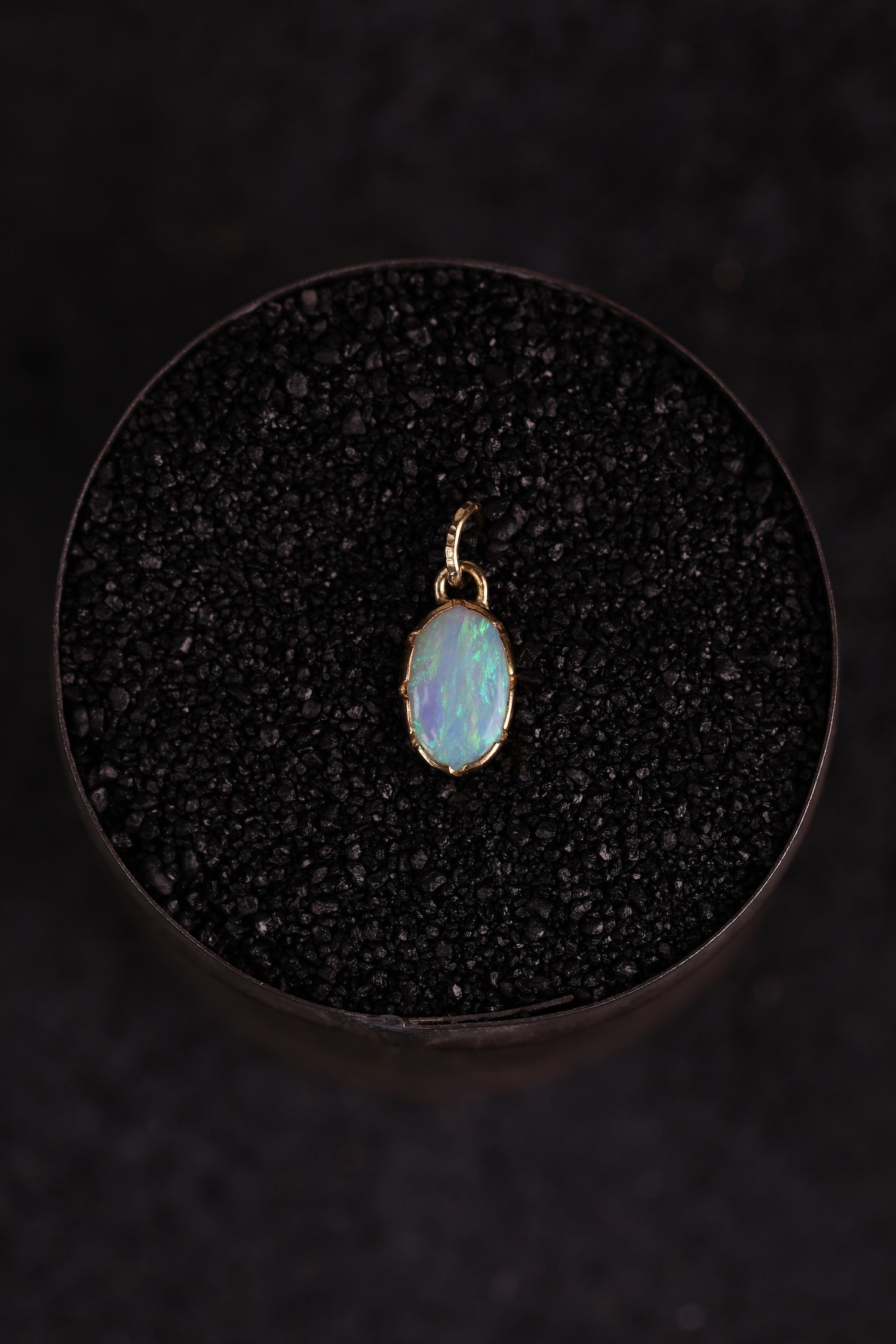 The blue of this opal is truly spellbinding and mesmerizing as is the long delicate shape of it. The opal is set in a 22k hand filled petal bezel, with an 18k jump ring made to fit over most clasps. Use your own chain or pick from my chain options.