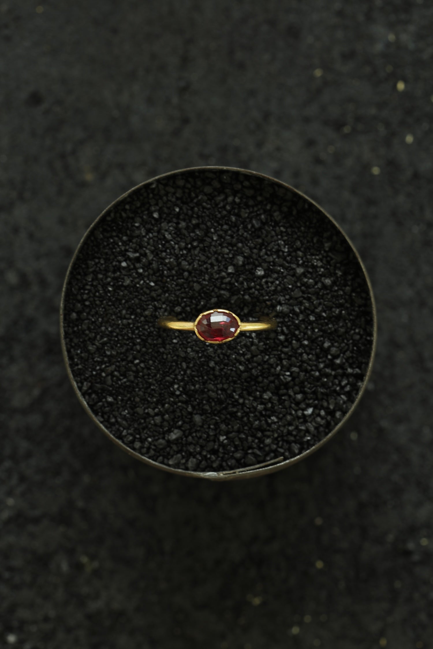 Rose cut oval ruby set in a hand crafted 18k gold petal bezel on a rounded band. Open back.
