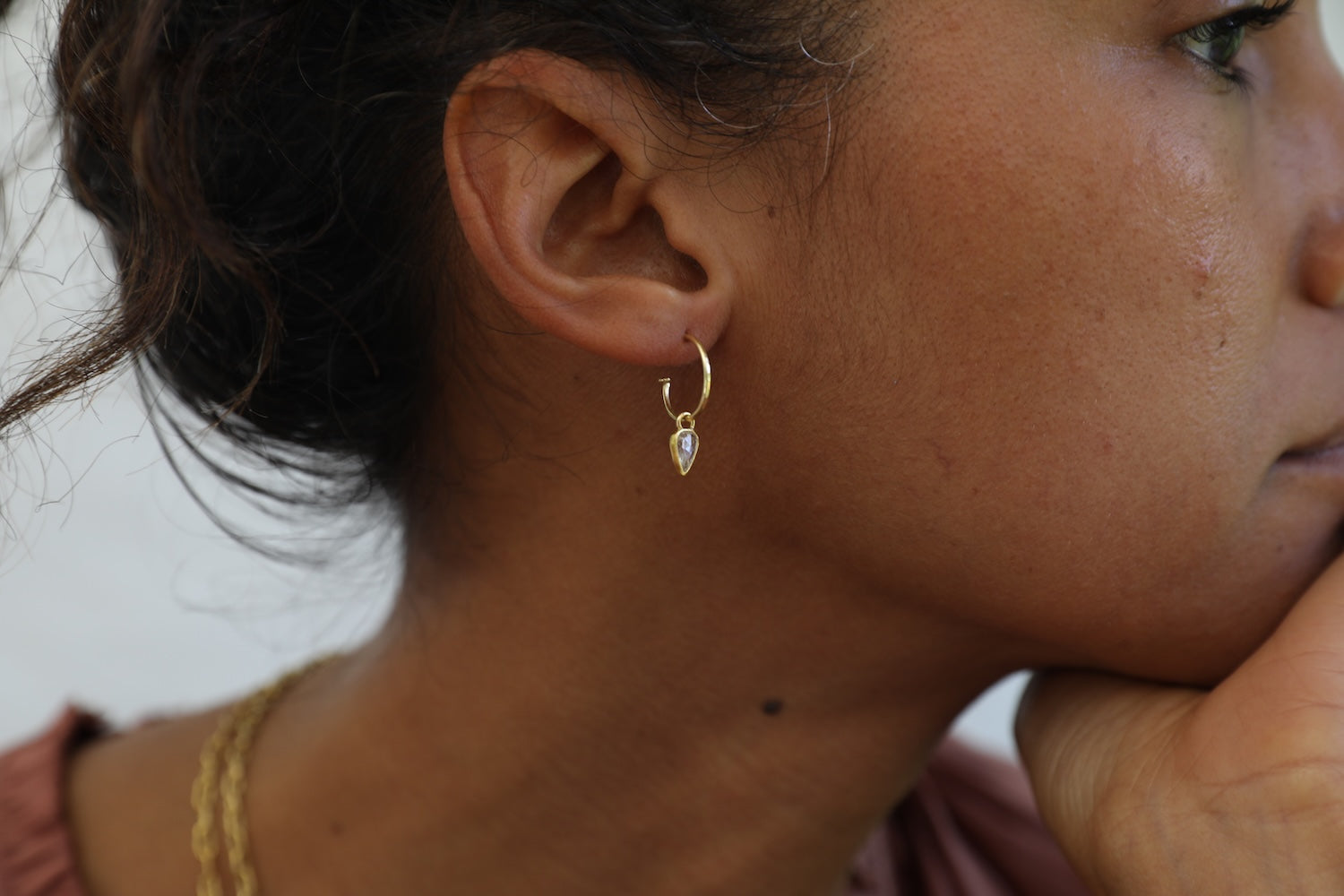 My all time favorite earrings. They sparkle beautifully and make such a simple and light statement. This pair are a combined .76 carats and are made with perfectly clear, white pear shaped rose cut diamonds. Set in 22k yellow gold bezels, hanging from 18k gold handmade ear wires, with a hammered coin to finish. There is something just so pretty and perfect about pear shaped rose cut diamonds!